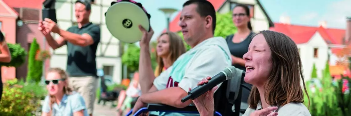 Zespół fundacyjnych muzykoterapeutów i wolontariuszek został zaproszony do organizacji otwartej sesji muzykoterapii podczas festynu na terenie domu pomocy społecznej. W sesji udział wzięła społeczność domu: dorośli i seniorzy z niepełnosprawnościami ruchu, wzroku oraz urazami neurologicznymi. Gośćmi festynu były także rodziny z dziećmi oraz mieszkanki i mieszkańcy okolicznej wsi. Na dziedzińcu domu mieszczącego się w zabytkowym dworku rozstawiliśmy okrąg z krzeseł, ułożyliśmy koce i poduszki do siedzenia. Instrumenty etniczne, drobne perkusjonalia, metalofony i bębny dostępne były na skraju koła. Wokół tak zaaranżowanej przestrzeni stanęły flagi-maszty z napisami „dołącz” i „graj”, podkreślające otwarty charakter spotkania.