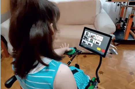 W innych sytuacjach Natalia korzysta z wózka aktywnego, dostosowanego do jej potrzeb. Po lewej stronie, na regulowanym ramieniu mocującym, zamontowany jest przełącznik typu buddy button, natomiast po prawej stronie znajduje się system montowania przełączników (switch mounting system), wykonany na zamówienie lub dostępny w wersji komercyjnej. System ten umożliwia szybkie, proste i bezpieczne mocowanie urządzeń, zapewnia ich stabilne utrzymanie w jednym miejscu oraz łatwe użytkowanie przez osoby korzystające z AAC. Zazwyczaj wyposażony jest w elastyczne ramię, które można rozciągać i mocować do płaskiej powierzchni, takiej jak blat stołu czy rama wózka inwalidzkiego.