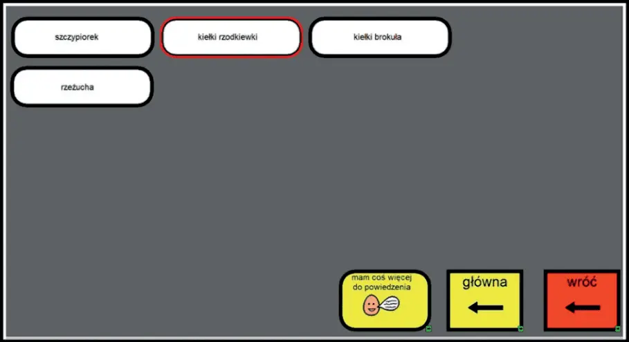 Dostęp do tabletu z zainstalowanym programem Boardmaker Speaking i Dynamically Pro został dostosowany do sytuacji sadzenia kiełków poprzez przygotowanie odpowiednich tablic dynamicznych. W przypadku Natalii zastosowano technikę pośrednią z użyciem przycisku, zwaną skanowaniem krokowym – wskaźnik przesuwa się przy każdej aktywacji włącznika. Liczba aktywacji potrzebna do wyboru komunikatu zależy od jego położenia na tablicy dynamicznej. Ta metoda minimalizuje trudności motoryczne i maksymalizuje dostęp do słownictwa, umożliwiając Natalii łatwy i komfortowy dostęp do potrzebnych komunikatów oraz wspierając jej aktywny udział w zadaniu.