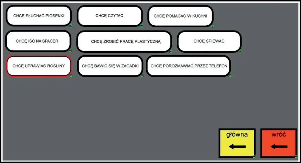 Tablice 1–4. Tablice dynamiczne stworzone w oprogramowaniu Boardmaker Speaking and Dynamically Pro, służące do wyboru aktywności: co chcę robić ⮕ ulubione czynności ⮕ chcę uprawić rośliny ⮕ kiełki rzodkiewki