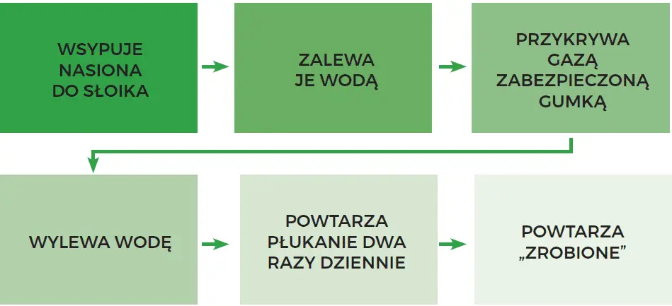 Każdy etap jest omawiany i wzmacniany słownym potwierdzeniem („Zrobione”). Po zakończeniu płukania słoik zostaje odstawiony na stojak w ciepłe miejsce, z dala od słońca, a po kilku dniach Natalia może z dumą cieszyć się świeżymi, własnoręcznie wyhodowanymi kiełkami.