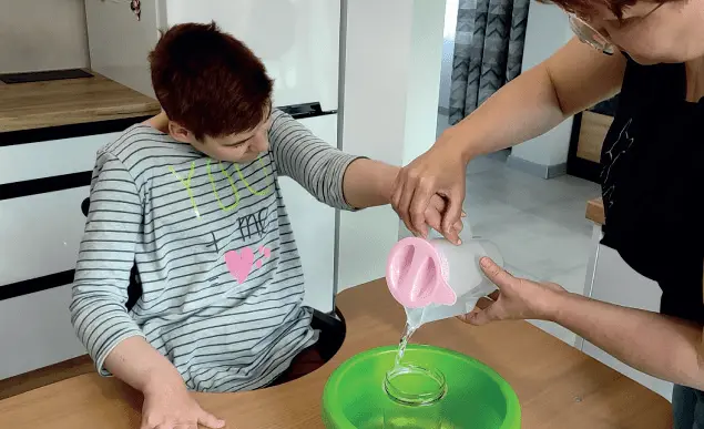 Zalewam nasiona wodą Postaw miskę na stoliku. Wstaw do niej słoik. Powiedz: ⮕ „Weź dzbanek z wodą”. Powiedz: ⮕ „Przekręć rękę”. Na koniec: ⮕ „Zrobione”. |
