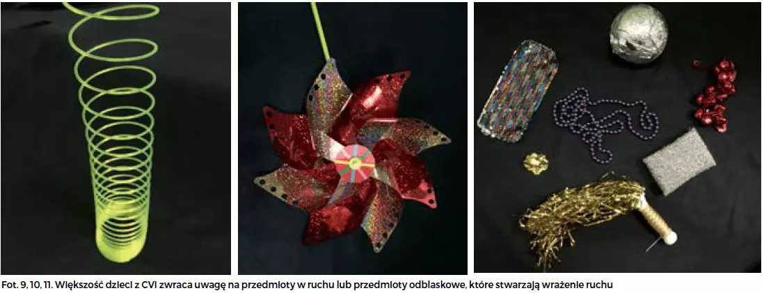 Wiele dzieci z CVI zaczyna używać wzroku, jeśli zaprezentujemy im przedmioty mające komponentę ruchu, koloru i światła. Część z nich często zauroczonych jest ruchem i światłem do takiego stopnia, że czasami ciężko jest im przerwać daną czynność.