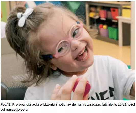 Innymi słowy, jeśli ustalimy preferowane pole widzenia, to nie korygujemy pozycji dziecka, lecz pozwalamy mu z niego korzystać, aby mogło rozwijać się poznawczo i uczyć. Jeśli natomiast chcemy poszerzyć lub zmienić pole widzenia, możemy wprowadzać korekcję lub adaptować środowisko w taki sposób, aby ten proces wspomóc.