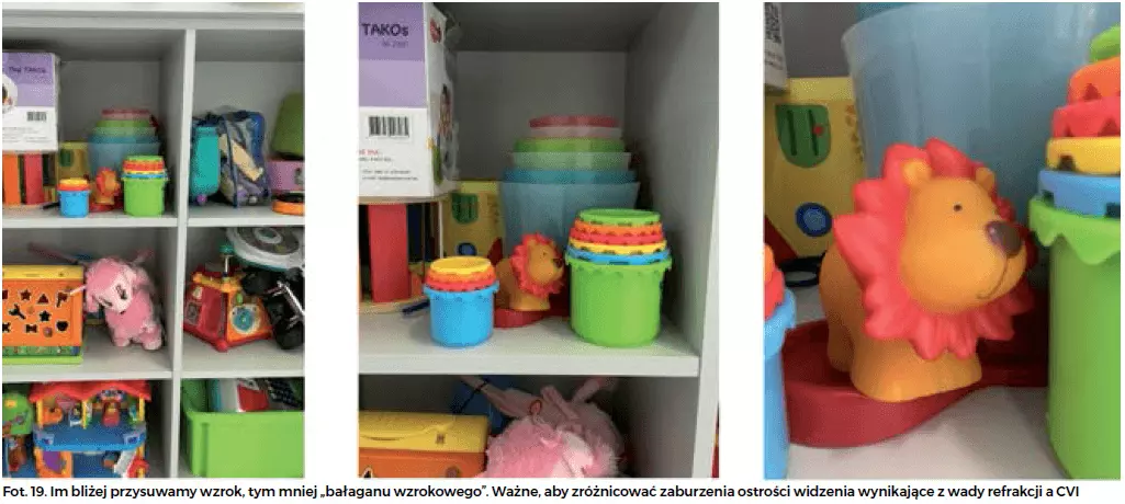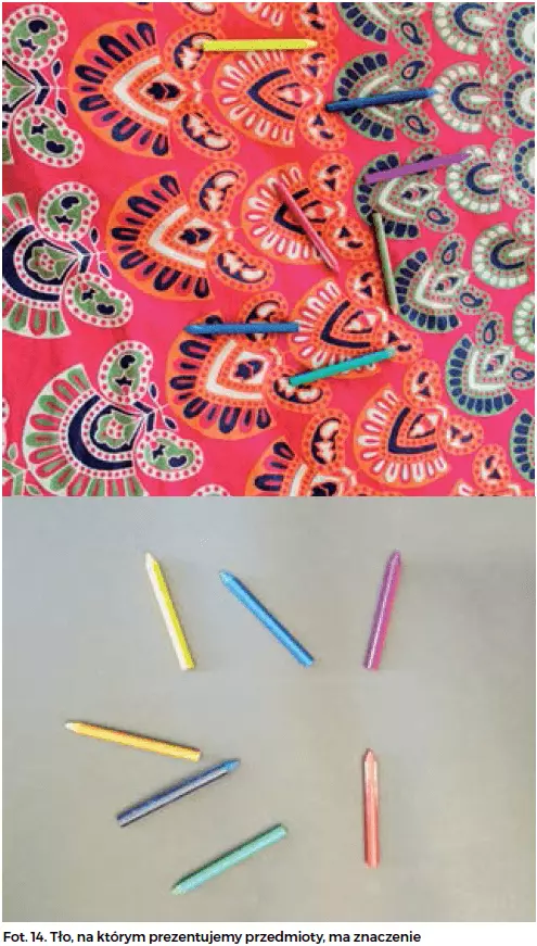 Podczas pracy z dzieckiem z CVI powinniśmy zwracać uwagę na całe otaczające nas środowisko: co znajduje się za nami, czy pracujemy przy lustrze, w co jesteśmy ubrani. Ma to ogromne znaczenie podczas identyfikacji przedmiotów przez dziecko.