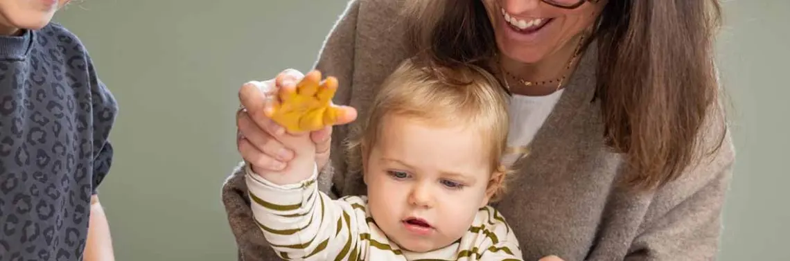 Farby do malowania palcami – pozwalają na kreatywność. Można zrobić kolorowy odcisk, połączyć kilka kolorów, a nawet domalować dodatkowe elementy – zmienić odcisk dłoni w kwiat (każdy palec to płatek) lub stopy w różne zwierzątka.