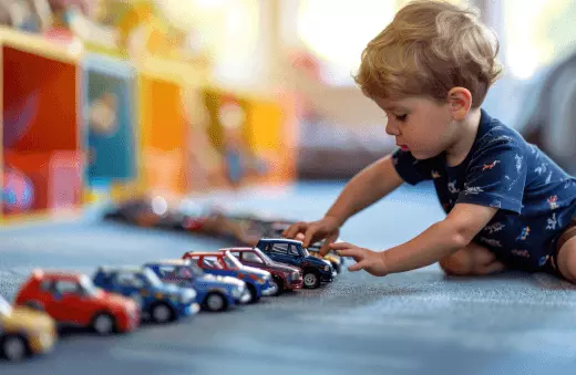 Przyglądając się zabawie dzieci z ASD, można zauważyć zdecydowaną większość aktywności mających charakter autostymulacji, schematów, braku zaplanowanej aktywności czy zupełnie brak wykorzystywania zabawek zgodnie z ich przeznaczeniem. Dziecko z autyzmem wybiera chętniej aktywność z przedmiotem niż z drugą osobą czy choćby z koniecznością respektowania jakichś społecznych umów, zasad czy konwencji. Dużo większą przyjemność ma z toczenia samochodu w przód i w tył, przyglądania się kręcącym się kołom niż z parkowania samochodu na zabawkowym parkingu, ładowania koledze klocków do ciężarówki, ścigania się po torze czy zabawy w sklep.